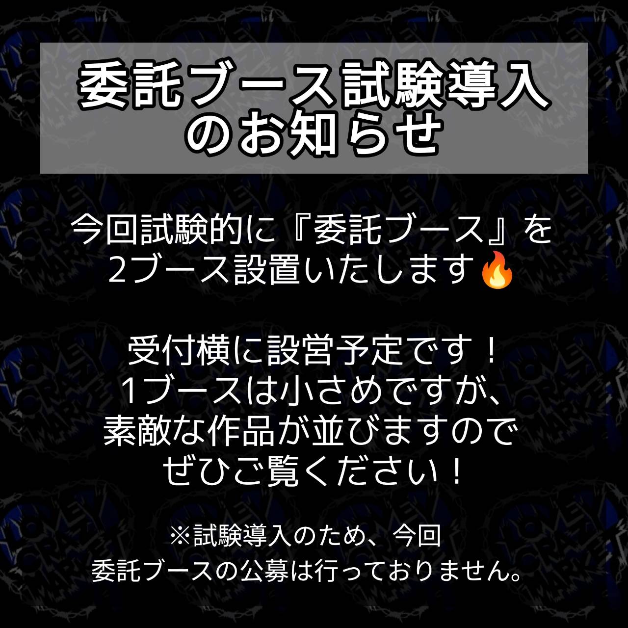 委託ブース試験導入のお知らせ NEWS 2026.01.19 今回試験的に『委託ブース』を2ブース設置いたします。 受付横に設営予定です!1ブースは小さめですが、素敵な作品が並びますのでぜひご覧ください! ※試験導入のため、今回は委託ブースの公募は行っておりません。